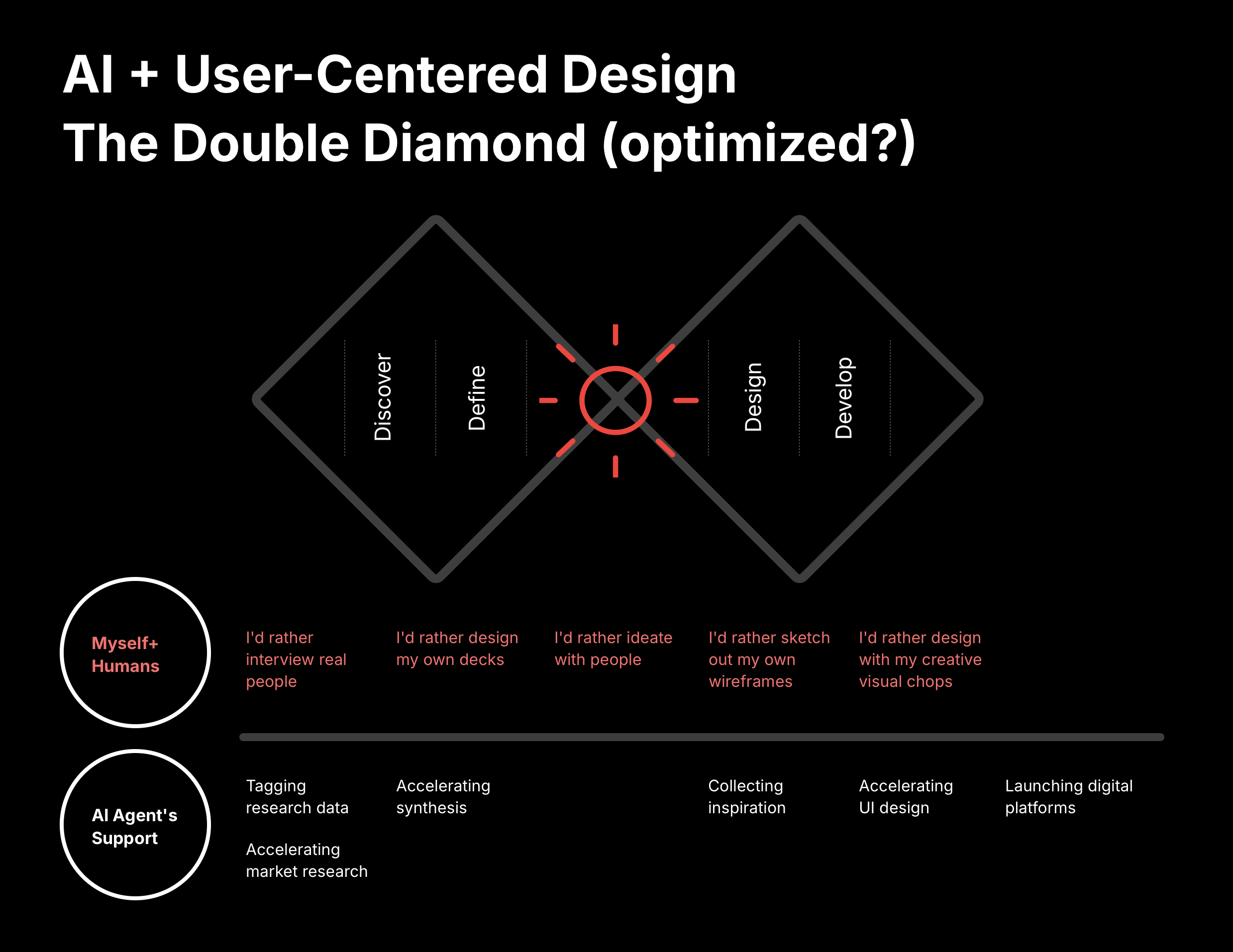 There has been a lot of change in the Design Thinking community with explorations of AI agents to optimize the practitioner’s workflow. Some are utilizing AI for almost every single touchpoint, including interviewing an AI agent in replacement of a human customer, when others are focusing on leveraging it more for proposing interview guides, ideating, and designing products.